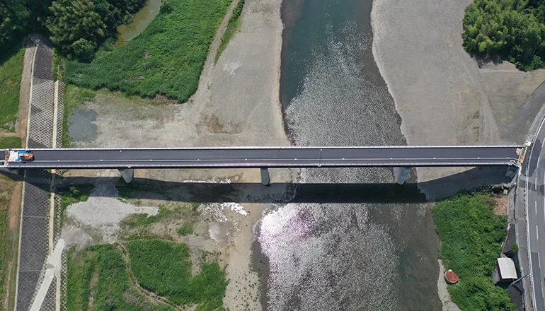 2018年の西日本豪雨により、大規模な被害を受けたこの地域では、長期にわたる復旧・復興工事が行われてきました。UKUYOでは大成橋の架替え工事の様子と、完成後の姿を映像として記録するため、ドローン空撮と地上撮影を実施し、編集した動画を納品いたしました。